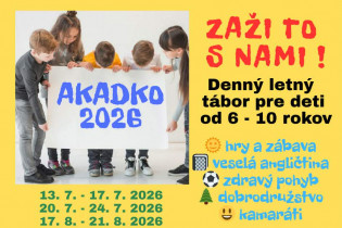 Od 07.03. - 11.03. ponúkame možnosť pre deti od 6.-10. rokov zúčastniť sa nášho denného anglického tábora Akadko 2022.Už tradične pripravujeme veľa zábavy, ale aj poučenia pre našich účastníkov - čaká ich zábavná angličtina, tvorivé dielne, výlety, h...